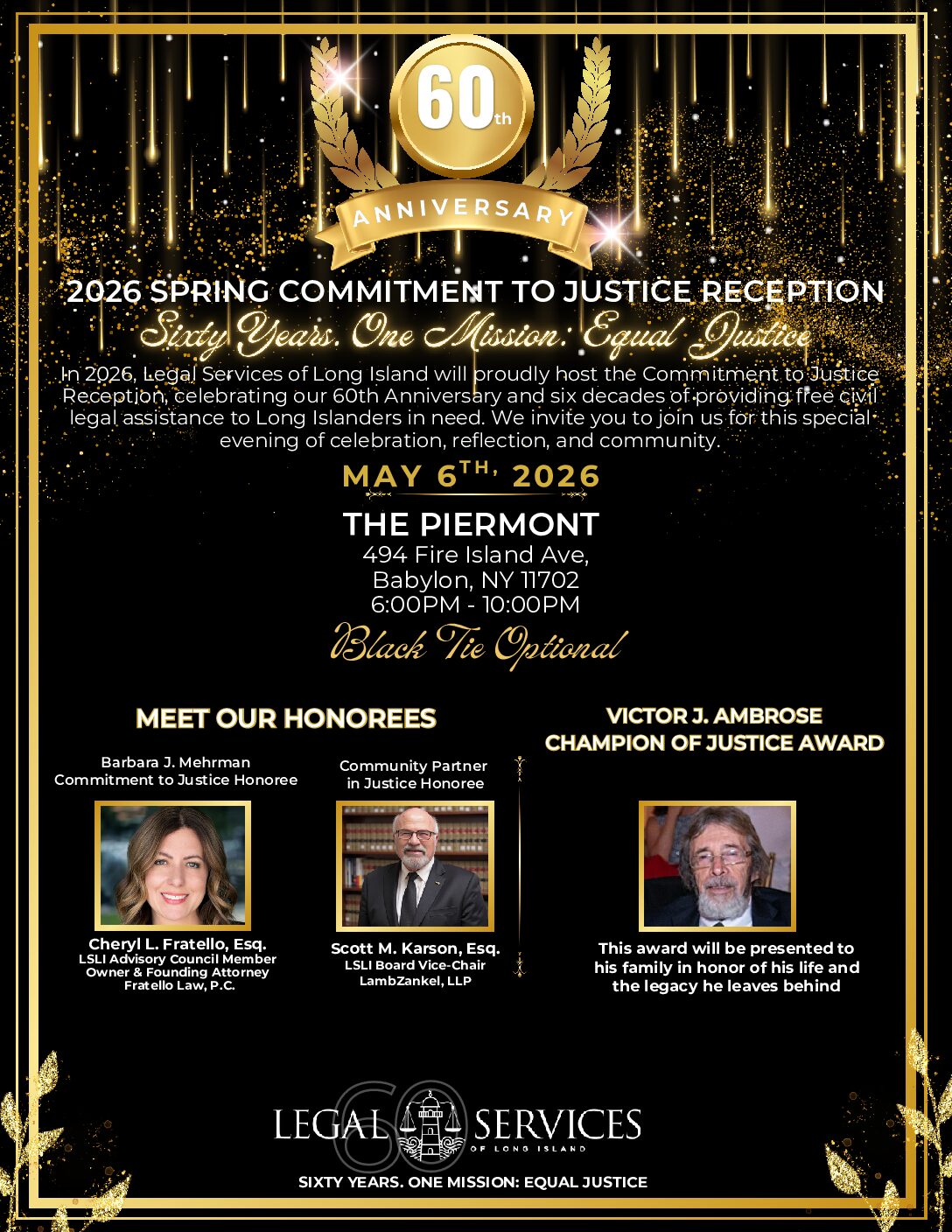 To honor this legacy and look ahead to the future, we are delighted to celebrate at our upcoming Commitment to Justice Reception to be held on Wednesday May 6, 2026, at The Piermont in Babylon, New York. Set against a beautiful waterfront backdrop, this special evening will bring together supporters, partners, and champions of justice to celebrate how far we’ve come and the vital work that still lies ahead.