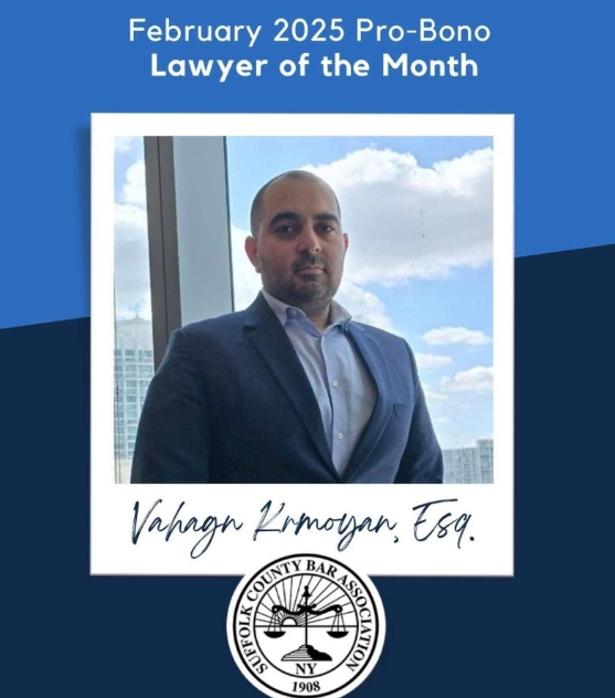 Congratulations to Vahagn Krmoyan on being honored this month as the Pro Bon Lawyer of the month by the Suffolk County Bar Association.