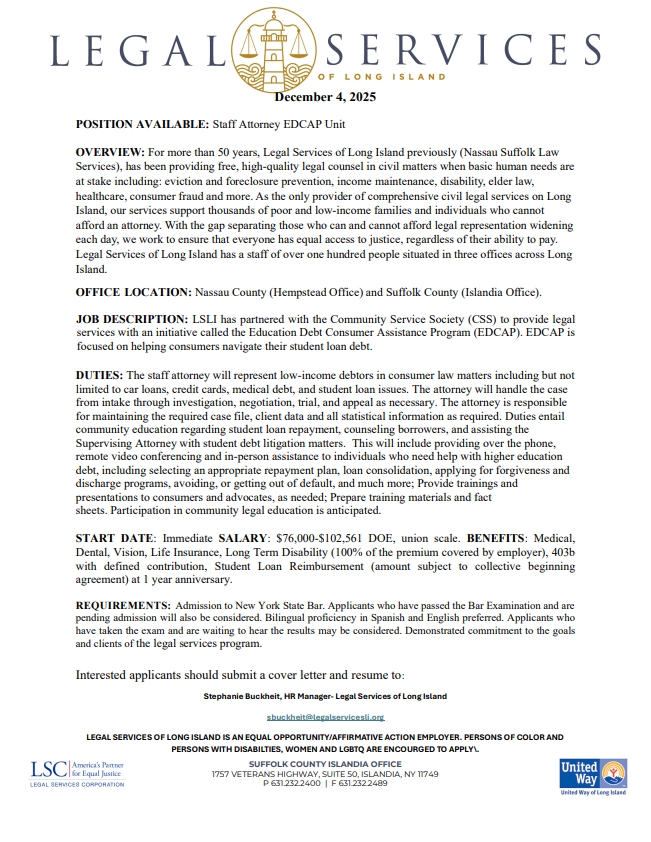 Veterans Disability Rights – Disability Programs 11.19.2025November 21, 2025POSITION AVAILABLE: Paralegal- EDCAP UnitDecember 2, 2025 Share Related postsPOSITION AVAILABLE: Paralegal HIV Law ProjectRead morePOSITION AVAILABLE: Paralegal- EDCAP UnitRead morePOSITION AVAILABLE: Staff Attorney- Domestic Violence UnitRead more