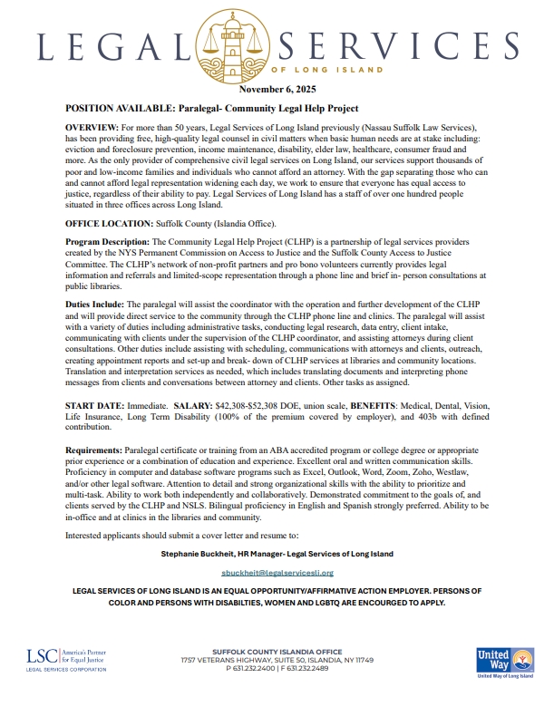 POSITION AVAILABLE: Staff Attorney- Veteran’s Rights ProjectNovember 13, 2025POSITION AVAILABLE: Staff Attorney- Domestic Violence UnitNovember 14, 2025 Share Related postsDecember 2, 2025POSITION AVAILABLE: Paralegal- EDCAP UnitRead moreNovember 25, 2025POSITION AVAILABLE: Staff Attorney EDCAP UnitRead moreNovember 17, 2025POSITION AVAILABLE: Paralegal- ICAN UnitRead more