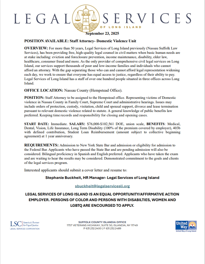 Volunteer Attorneys and Paralegals Needed! Join us at the Pro Bono Open House. Sign Up to Volunteer Now!September 2, 2025POSITION AVAILABLE: Paralegal- Domestic Violence UnitSeptember 26, 2025 Share Related postsOctober 1, 2025POSITION AVAILABLE: Staff Attorney in Adult Care Facility ProjectRead moreSeptember 26, 2025POSITION AVAILABLE: Paralegal- Domestic Violence UnitRead moreSeptember 26, 2025POSITION AVAILABLE: Paralegal- Domestic Violence UnitRead more