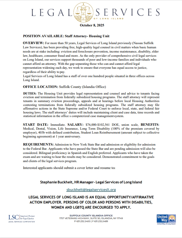 POSITION AVAILABLE: Paralegal- Domestic Violence UnitSeptember 26, 2025POSITION AVAILABLE: Staff Attorney- Veteran’s Rights ProjectOctober 15, 2025 Share Related postsNovember 17, 2025POSITION AVAILABLE: Paralegal- ICAN UnitRead moreNovember 14, 2025POSITION AVAILABLE: Staff Attorney- Domestic Violence UnitRead moreNovember 14, 2025POSITION AVAILABLE: Staff Attorney- Housing UnitRead more