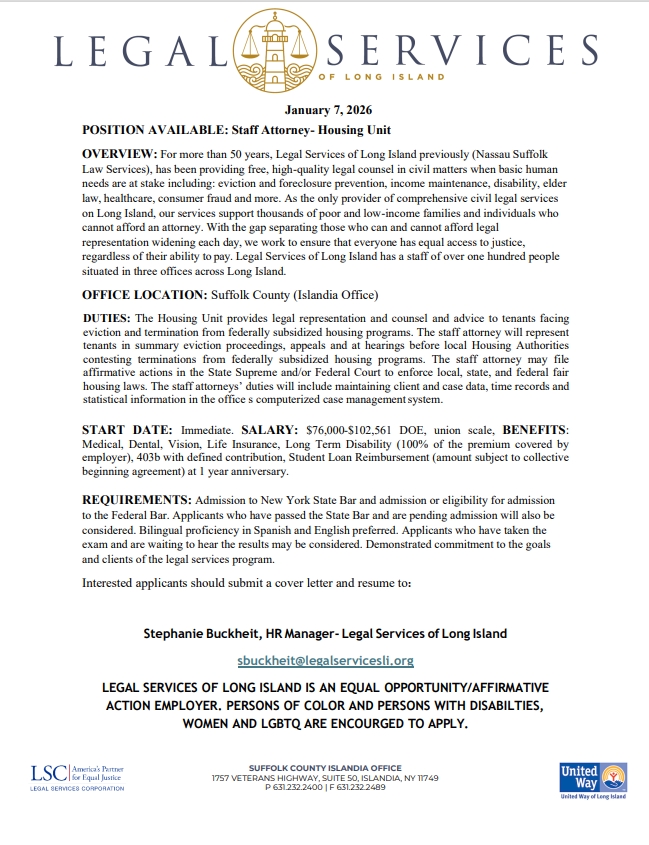 Expanded Access to Compensation for Victims and Survivors of CrimeJanuary 6, 2026POSITION AVAILABLE: Staff Attorney- Housing UnitJanuary 8, 2026 Share Related postsPOSITION AVAILABLE: Staff Attorney- Housing UnitRead morePOSITION AVAILABLE: Paid Student Interns for Landlord Tenant Court Read morePOSITION AVAILABLE: Paralegal in the Pro Bono UnitRead more