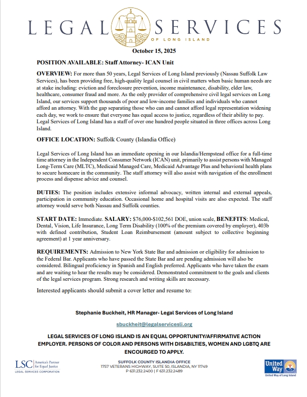 POSITION AVAILABLE: Staff Attorney- Housing UnitOctober 8, 2025POSITION AVAILABLE: Staff Attorney- Veteran’s Rights ProjectOctober 15, 2025 Share Related postsOctober 16, 2025POSITION AVAILABLE: Staff Attorney- HIV Law ProjectRead moreOctober 15, 2025POSITION AVAILABLE: Staff Attorney- Veteran’s Rights ProjectRead moreOctober 8, 2025POSITION AVAILABLE: Staff Attorney- Housing UnitRead more