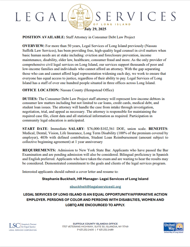 POSITION AVAILABLE: Staff Attorney- Housing UnitAugust 26, 2025POSITION AVAILABLE: Receptionist/Clerk/Typist in our Riverhead Office-PART TIMEAugust 26, 2025 Share Related postsOctober 16, 2025POSITION AVAILABLE: Staff Attorney- HIV Law ProjectRead moreOctober 15, 2025POSITION AVAILABLE: Staff Attorney- Veteran’s Rights ProjectRead moreOctober 15, 2025POSITION AVAILABLE: Staff Attorney- ICAN UnitRead more